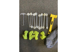 4 reflective rope, 4 wind rope buckle (on the rope), 15 tent stakes, 1 Hammer, 1 hook and 1 storage bag.