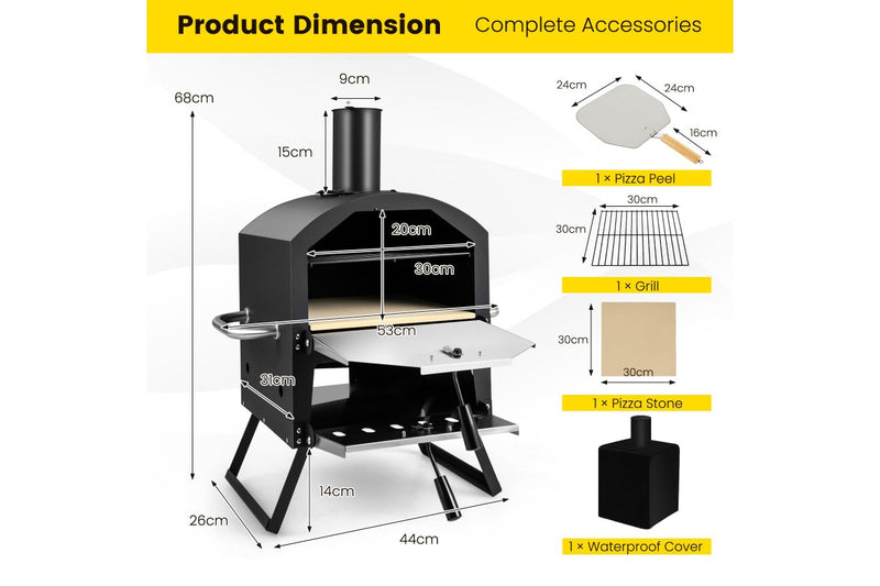 Comes with 1 pizza stone, 1 cooking grill, 1 pizza peel and 1 waterproof cover