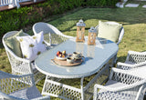 The Julia Outdoor Oval Dining Table is a perfect addition to your outdoor space inspired by the timeless elegance of the Hamptons. Crafted with a beautifully woven rattan design, this dining table exudes sophistication while providing exceptional durability. Its sturdy galvanised steel frame ensures long-lasting stability, making it a reliable choice for outdoor use.