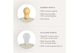 All the pacifiers in FRIGG range are round pacifiers with a round nipple shape. The round pacifier resembles a mother’s breast in both shape and material. The explanation for this is that when the child is about to breastfeed, the tongue rolls up around the nipple and creates a vacuum, which causes the milk to flow. When the child sucks on a round pacifier, it rolls its tongue around it the same way.