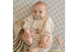 The FRIGG line of natural rubber pacifiers have been thoughtfully designed for your baby’s comfort. The outward curve keeps the pacifier off their delicate skin, while features like air holes and a security handle ensure your baby stays safe. Available in a range of soft colors, FRIGG pacifiers make a beautiful addition to your collection of baby essentials.