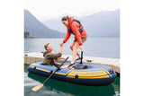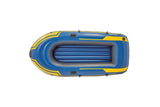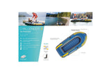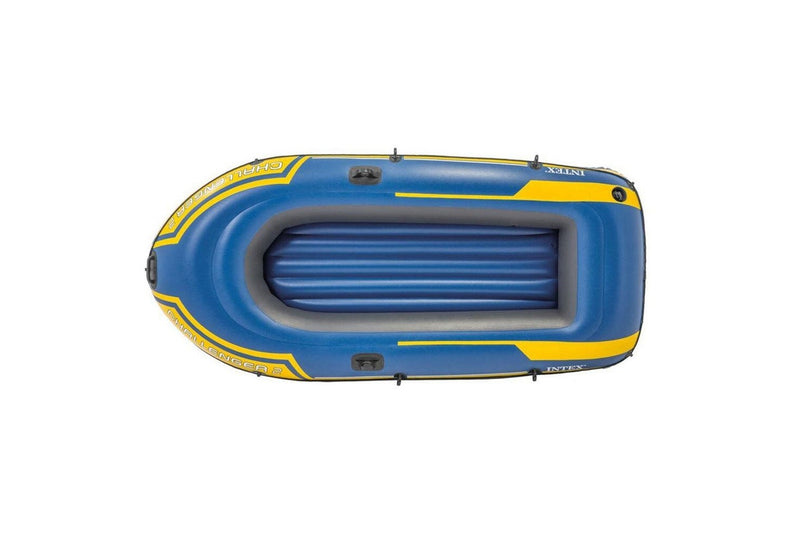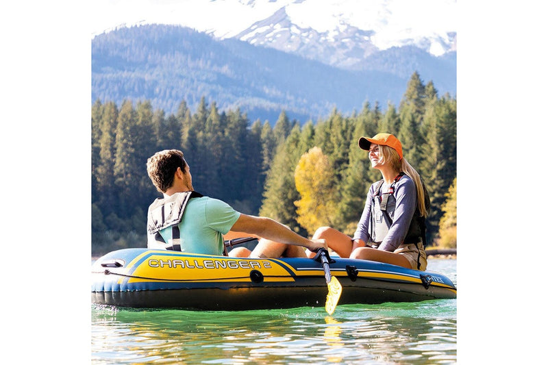 The Challenger 2 inflatable boat is perfect for boating fun for two adults. Whether fishing, relaxing, or rowing on the lake, this boat is great for making your adventure exciting and entertaining. Designed with heavy duty, puncture resistant PVC for comfort and durability, and an inflatable I-beam floor for rigidity, the boat contains three air chambers including an inner auxiliary chamber inside the main hull for extra safety. Inflating and deflating is a breeze with two quick-fill Boston valves. A grab handle on the bow and an all-around grab line are provided for your convenience, as well as welded oar locks, oar holders and a repair patch kit. Also included are two 48 inch French oars and an Intex high-output pump for inflating and deflating.