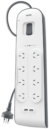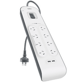 | What's In The Box: | Belkin BSV804 8-Outlet 2-Meter Surge Protection Strip with two 2.4 amp USB charging ports |