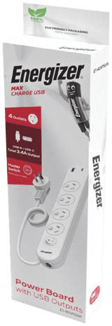Energizer 4 Outlet Power Board with Surge Protection & 2 USB Ports