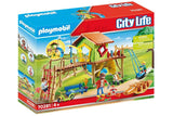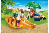 What could be nicer than romping and playing outside in the fresh air? The Adventure Playground offers everything that little bundles of energy need to have real fun. Slide, tire swing, climbing wall, of course all playground equipment has to be tested properly. Children’s fa­vourite is the great crocodile seesaw, on which they can bounce and swing for hours. While the children play, daddy makes himself comfortable on the bench. The play set contains four PLAYMOBIL figures, a playground with climbing house, slide, tire swing, climbing wall, bench, crocodile seesaw, scooter, buggy and many other extras.