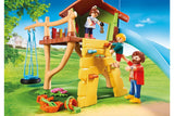 • Accessories: 1 playhouse with climbing net, climbing wall, slide and swing; 1 crocodile seesaw, 1 tree, 1 bench, 1 wheel, 1 buggy, 1 flagpole with flag, 1 sand bucket, 1 sand shovel, 1 sand rake, 1 sand sieve, 1 watering can, 1 teddy bear, 1 shoulder bag, 1 apple, 1 water bottle, 1 hair bow, 1 beard