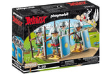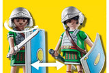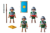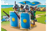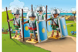 The year is 50BC. For many months, the Roman legionaries stationed as garrison in the fortified camps of Totorum, Aquarium, Laudanum and Compendium have been trying to capture a small village of indomitable Gauls that does not stop resisting the invader. To defeat the Gauls for good, the Romans attack with their famous turtle formation. In this special attack formation, the soldiers make their way protected by shields in front and above. But once again, Asterix, Obelix and the villagers have no intention of surrendering without resistance. A quick sip of magic potion and off they go into battle. Life is not easy for the Roman legionaries who have to deal with these Gauls. The PLAYMOBIL set consists of four Romans with helmets, swords and shields. A stand plate is included for each figure for more stability. All figures have an alternating face that shows the faces before and after the battle.