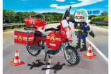 With the fantastic PLAYMOBIL set Motorcycle & Oil Spill Incident, every child becomes a rescue hero! The firefighter navigates through traffic jams on his agile motorcycle, securing the accident scene with pylons. The movable handlebars and stand provide realistic play, while the figure sits securely on the motorcycle. The fire extinguisher and luggage box can be attached to the side behind the seat and carried when detached. Removable glove attachments, a movable visor helmet, and a chest protector allow for detailed role-playing. This set not only stimulates imagination but also enhances motor skills and a sense of responsibility – the perfect gift for aspiring young lifesavers aged 4 and up!