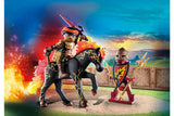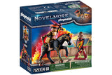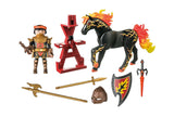 Jump into the fray with the heated Burnham Raiders Fire Knight from PLAYMOBIL. Brody Burnham also does not want to miss the jousting tournament and prove his skills. Together with his fiery horse, he diligently trains various disciplines to make a good figure at the tournament. On the weapon stand he can store sword, spear, shield and helmet. With clever functions and interesting characters, the Novelmore range invites you to exciting knightly adventures. Great fun for children aged 4 and up.