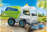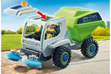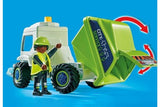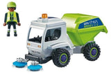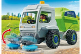 The kit includes a road sweeper with rotating brushes and a Playmobil figure with a cap. When the machine brushes tick the ground and they will rotate automatically. To empty the garbage truck, the tailgate can be opened and the garbage container is tipped.