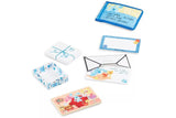 - Includes wooden postcard and stamps, envelope and invitations to mail, double-sided puzzle, 10-piece wooden memory game, gift box, shipping pouch, reusable activity magazine; personalize with three sheets of reusable stickers