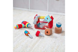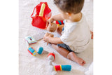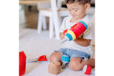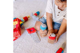 Here is a handy plush toolbox with a “ruler” handle. This nine-piece set includes a hammer, screwdriver, saw, nails, screws, blocks and a drill that vibrates. Constructed of high quality fabrics and pthalate-free plastic, this durable set will provide hours of spilling, filling and building fun.