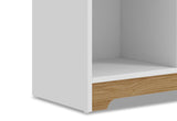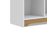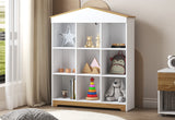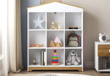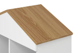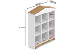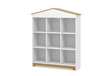 Finished in white with natural-coloured accents, it brings a clean, modern aesthetic to any space. The nine open cubes offer versatile storage for books, decor, or organizational items, while the house-frame structure adds a playful yet stylish touch.