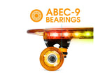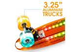 The Madd Gear 22” Light-Up Retro Skateboard is perfect for on-the-go skaters! Its compact size is easy to carry and the translucent deck features embedded LED lights that flash to match your style. This skateboard comes fully assembled and is ready to ride right out of the box. The smooth-rolling 62mm wheels and fast ABEC-9 bearings provide a smooth ride, while the durable aluminium trucks ensure longevity.