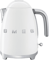 Boasting the iconic Smeg 1950s silhouette with an enamelled-coated stainless steel body and chrome detailing, this white Smeg 50's Retro Style Kettle KLF03WHAU turns the humble kitchen kettle into a statement appliance worthy of showing off. With its 1.7 litre capacity, you can boil up to seven cups of coffee or tea in no time, while 2400 watts of power ensures a speedy, yet quiet boil. It has a soft-opening lid to slowly release steam and prevent hot water splash back.
