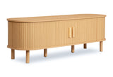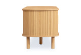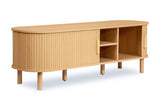 With its smooth curved edges and stylish panelled tambour doors, it's as fun to look at as it is functional. Slide open the doors to reveal two centre shelves-perfect for your tech-and extra storage on either side for all your bits and bobs.
