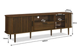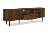 It features two sliding doors for hidden storage, a generous drawer, and open shelving ideal for media essentials. Thoughtful design details like panelled features, curved edges, and contrast black handles enhance its refined look.