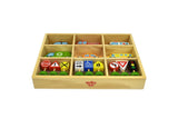 Presented in this beautiful wooden display case are 6 wooden vehicles and street signs.