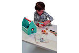 An adorable Tender Leaf Toys branded woodpecker themed toolbox filled with everything you need to build something on your own. With two removable lid pieces that turn into screwable plates and a cloth printed bag to pack away after play. A chalkboard is featured on the toolbox for you to record your inventions.