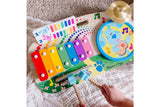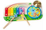 - Includes drum, chimes, xylophone, and cymbal built into a wooden board, 2 drumsticks, and 2 double-sided music cards