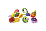 - Fruit pieces have holes in the middle so you can thread them onto the caterpillars’ strings