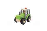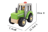 Sturdy green wooden tractor with rubber wheels to protect surfaces. Featuring natural beech wood and non-toxic paint. Cute little farmer behind the wheel.