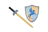 Enter the world of medieval adventures with the Wooden Sword and Shield set from Kaper Kidz. This set includes a wooden sword and shield, featuring a shield adorned with a fantastical medivel unicorn Pegasus design.