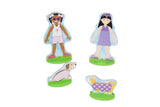 Combine dozens of magnetic pieces in coordinating designs to dress two friends and their pets (a precious puppy and cute kitten) to tell stories about these best friends! Mix and match coordinating magnetic clothing and accessories to dress the dolls. The dolls, each with a durable stand for pretend play, and the pieces all store in a sturdy wooden tray with a slide-in lid and convenient carrying handle to take the fun on the go! This unique dress-up dolls set helps kids three and older develop hand-eye coordination and fine motor, counting, and sorting skills, and encourages creative expression and imaginative play.