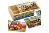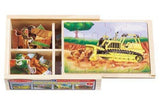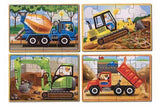 Set includes four wooden, 12-piece construction vehicle jigsaw puzzles– a cement mixer, a bulldozer, a dump truck and an excavator– each stored in a separate compartment of a sturdy wooden box!