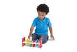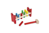 Pound the eight colourful wooden pegs into the wooden bench, then flip it over to repeat the activity again and again!