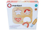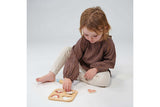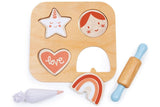Practice baking at home! This wooden cookie cutter toy comes with a tray with shape-sorting cut outs, 4 illustrated pretend cookies, a toy rolling pin, and a pretend icing bag.