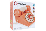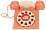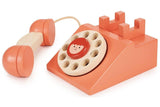 This old fashioned wooden telephone toy has a removable receiver attached with a cord, and a finger dial that goes round, with an illustrated face.