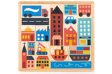 This town themed wooden puzzle comes with 17 removable illustrated pieces that can be matched up to their corresponding imagery.