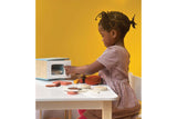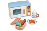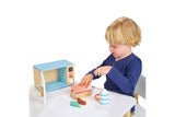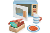 A wooden toy pretend microwave to heat up your dinner and hot chocolate! This set includes a cup with removable whipped cream, a plate and a Tupperware-style wooden box and lid that contains a sausage, baked beans and broccoli. Microwave oven has an opening door, and a clacking knob and two push buttons. A nice way of teaching children about not wasting food, and inspiring new skills in the kitchen.