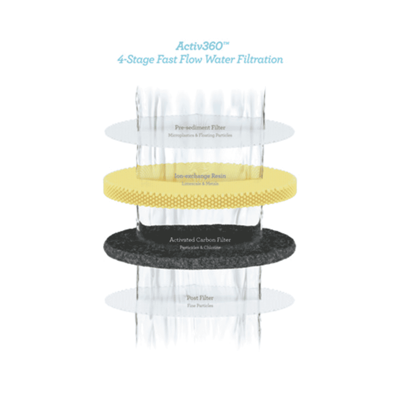 The 4 stage Activ360 filter removes almost all contaminants, heavy metals, chlorine and fine particles from water while having a lifespan 3 times longer than traditional jugs to reduce environmental impact.