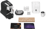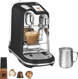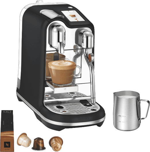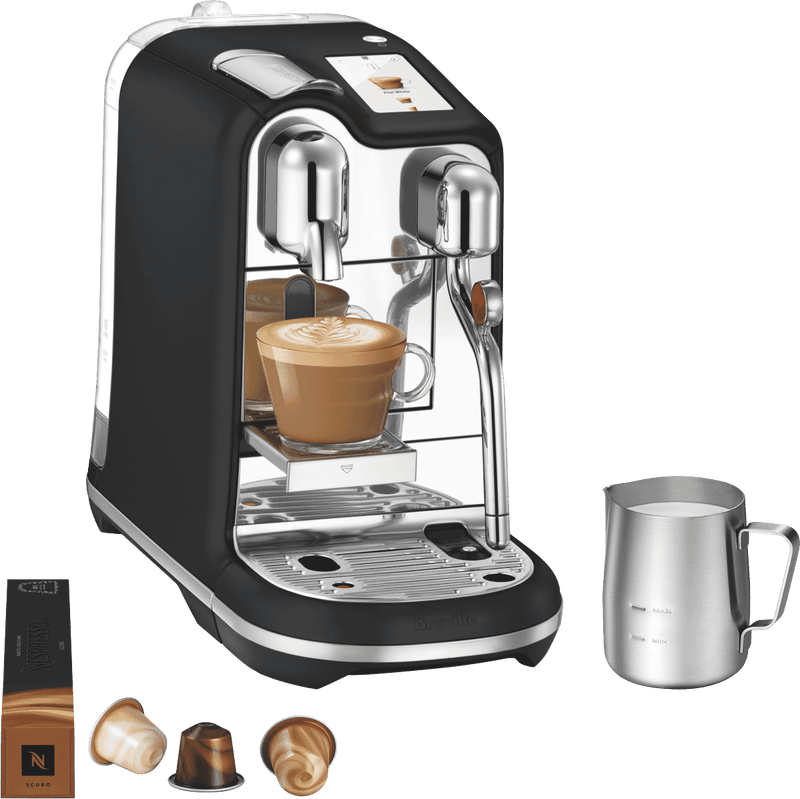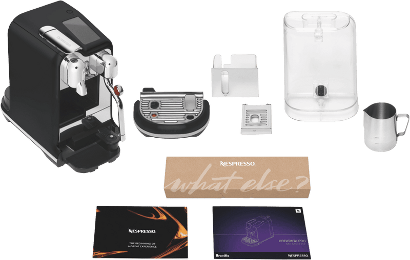 What's In The Box: Breville The Creatista Pro Black Truffle, all included accessories - Stainless Steel Milk Jug & Tasting Box of Nespresso Capsules