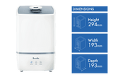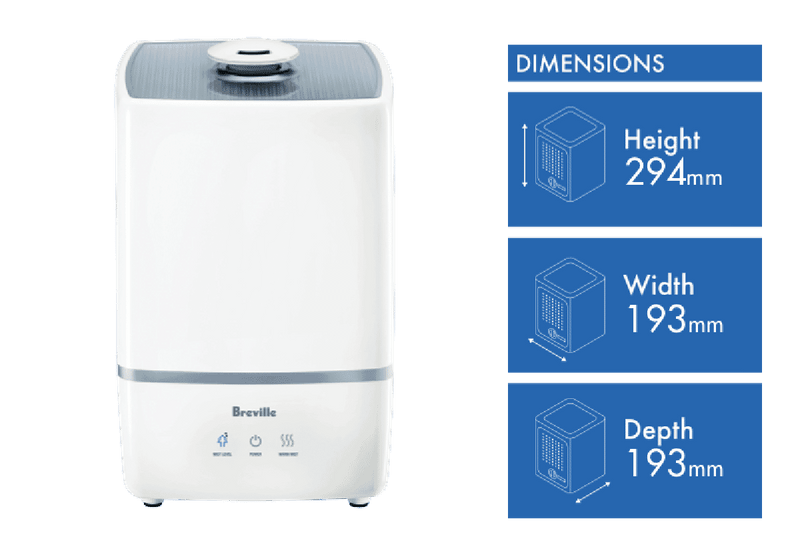 The cool and warm mist settings allow you to create a soothing environment, while the integrated aroma tray lets you add your favourite essential oils. This humidifier also utilises ultrasonic technology for near-silent operation and is easy to refill thanks to the large, removable 5L water tank. Measuring 192mm wide, 294mm high and 192mm deep and weighing just 1.8kg, the compact Breville humidifier can sit neatly on your desk or side table.