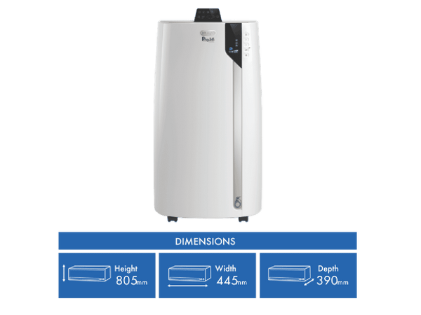 Escape the summer heat with the DeLonghi 2.9kW Portable Air Conditioner. This powerful and versatile 3-in-1 unit provides cooling, fan, and dehumidification modes to transform any room into an oasis. With its brilliant white finish and compact size measuring just 450mm wide by 750mm high and 410mm deep, it blends into any decor.