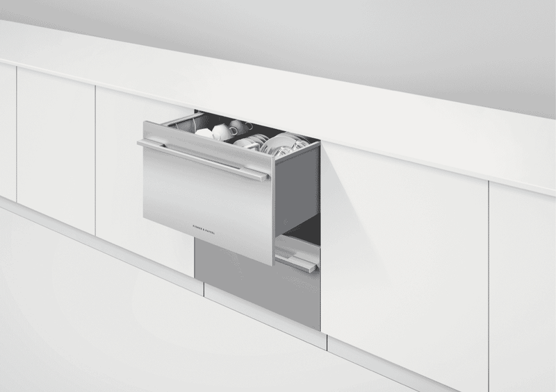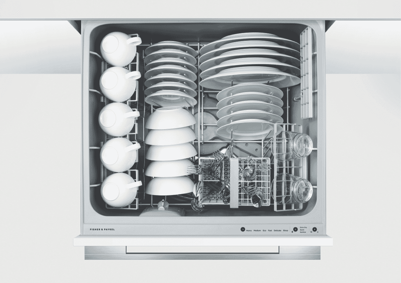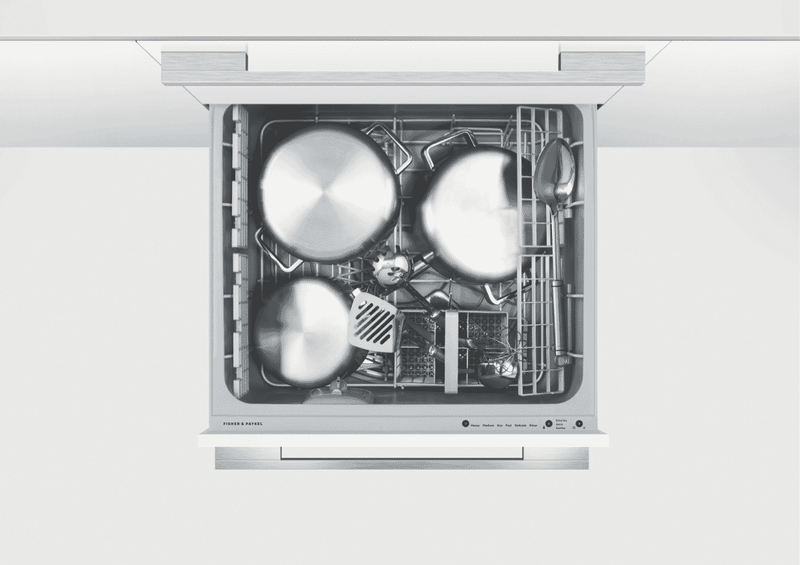 The Fisher & Paykel Double Dishdrawer is designed for convenience. Knock twice on the front panel to pause the cycle, then knock again to resume washing. The internal wash selector lets you choose different wash programs in each drawer.