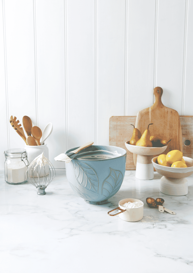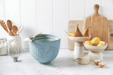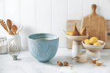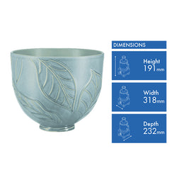 Add a touch of elegance to your kitchen with the KitchenAid 4.7L Spring Leaves Ceramic Bowl. This beautiful bowl features an intricate textured leaf pattern in a stunning reactive blue-green glaze, complete with a smooth matte exterior finish.