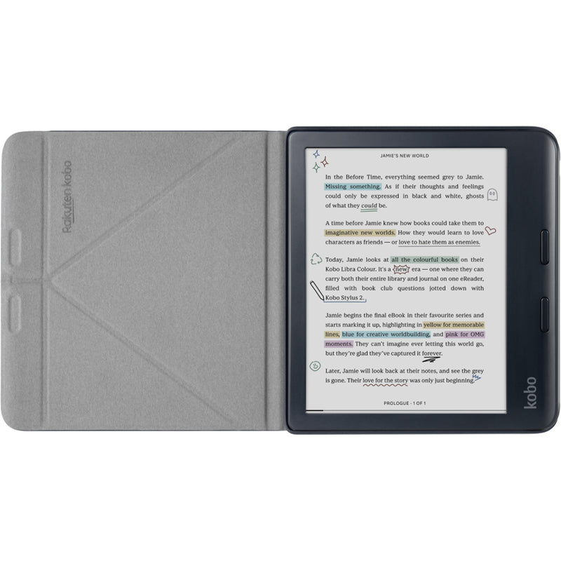 Made with recycled materials, the Kobo Libra Colour SleepCover is the best way to take your eReader with you wherever you go, personalize it, and keep it looking great. It's also made to move with you: the built-in stand lets your eReader stand on its own in portait or landscape mode. Kobo Libra Colour wakes automatically when you open the cover and sleeps when you close it.