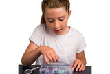 Inside you get hematite, two samples of rose quartz, snowflake obsidian, tiger’s eye, red jasper, two samples of green aventurine, green zebra jasper, desert rose, pumice, pyrite, blue quartz, blue calcite, and fluorite. There’s also a magnifying glass to inspect the rocks, gemstones, and crystals with and a clear storage and display case.