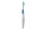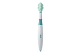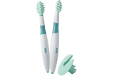 The NUK Training Toothbrush Set is ideal for introducing your child to teeth cleaning step-by-step. The Brush-and-Bite Teething Trainer gently massages specific areas of the gums and the roof of the mouth and helps to relieve the pressure from teething. The soft, bite-resistant rubber tips of the Brushing Trainer gently clean the first visible, little teeth. Your child learns the right movement for cleaning teeth at the same time.