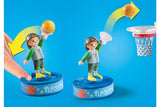 The set consists of a gym extension, three PLAYMOBIL figures, a basketball hoop with basketball, gymnastic bars, soccer goal and soccer ball, tennis rackets and other great extras for sporty fun in the children’s room.