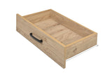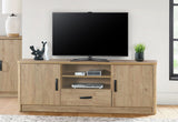 Featuring a sleek oak-coloured finish, it combines natural warmth with modern design. The unit offers ample storage with two doors, one spacious drawer, and an open shelf, perfect for organizing electronics, media, or décor. The contrasting black handles add a contemporary touch, enhancing its visual appeal.