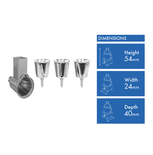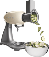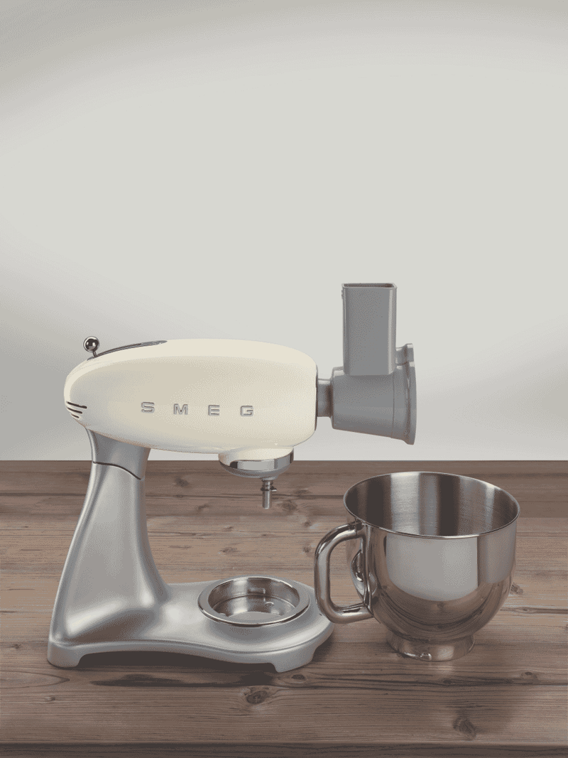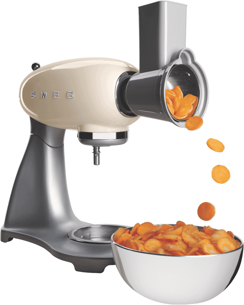 This durable six piece Smeg Slicer and Grater set includes coarse and medium grating cylinders and a two-piece slicing cylinder for slicing and grating vegetables and fruits. Designed for use with your Smeg 50's Style Stand Mixer SMF02 (sold separately), this slicer and grater accessory set is easy to disassemble for compact storage and washing.