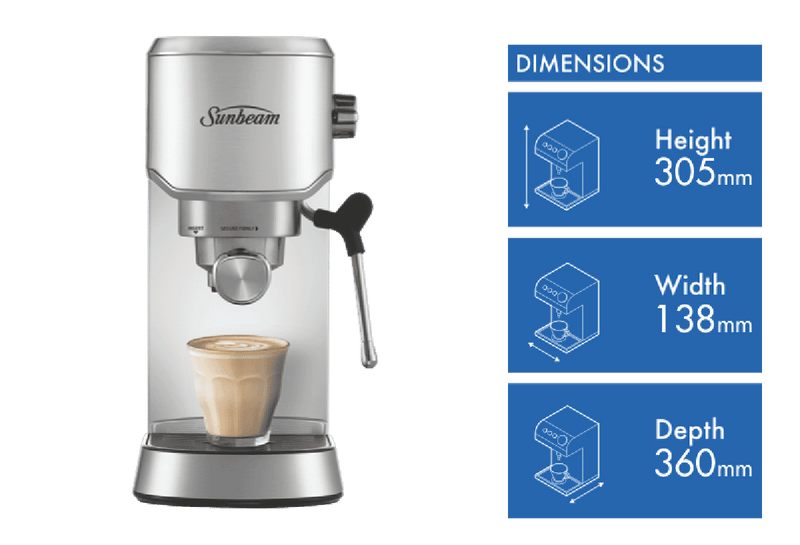 Programmable descaling alerts help maintain flavor and performance. Measuring just 305mm high, 360mm deep and 138mm wide, the Sunbeam Compact Barista Espresso Coffee Machine combines commercial-grade engineering with a compact footprint that fits perfectly on your kitchen benchtop. Craft barista-quality coffee drinks at home every day with this versatile manual espresso machine. The manufacturer's part number for this product is EMM2900SS. Discover the joy of being your own barista today.